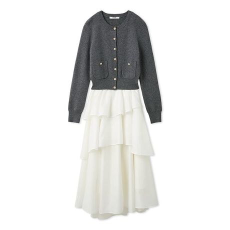 イエロー(ニットがバター風味のまろやかなイエロー、スカートがホワイト)、グレー(ニットがグレー、スカートはホワイト)、ボーダー(ブラックとアイボリーのボーダーピッチ、スカートはホワイト)の3色展開です。ニットのみサステナ素材を使用しています。