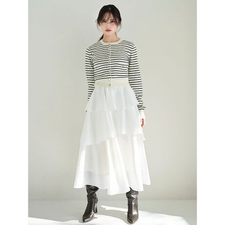 イエロー(ニットがバター風味のまろやかなイエロー、スカートがホワイト)、グレー(ニットがグレー、スカートはホワイト)、ボーダー(ブラックとアイボリーのボーダーピッチ、スカートはホワイト)の3色展開です。ニットのみサステナ素材を使用しています。