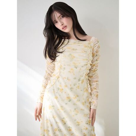 伸縮性と程よい透け感のあるフロッキーチュールにプリントを施した、ロマンティックなロングワンピースが届きました。軽やかなチュールに起毛感のあるフロッキー加工を加えて表面感を出しているので、肌寒い季節にもぴったりのアイテム。ロングシーズンご着用いただけます。タイトなシルエットですが、前後身頃や、袖にギャザーをたっぷり入れてドレッシーに仕上げ、切り替えを入れてボディラインに添いながらも、程よく拾いすぎないシルエットで、着用しやすくお作りしています。後ウエストに紐がついているのでウエストを絞ることもできます。スカート部分は生地のオチ感を活かしたナローシルエットでエレガントに。伸縮性のある生地なので、被りでご着用いただけます。肩はオフショルにも出来るデザインで、シーンに合わせてアレンジいただけます。裏地付きです。