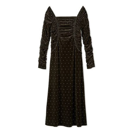 伸縮性と程よい透け感のあるフロッキーチュールにプリントを施した、ロマンティックなロングワンピースが届きました。軽やかなチュールに起毛感のあるフロッキー加工を加えて表面感を出しているので、肌寒い季節にもぴったりのアイテム。ロングシーズンご着用いただけます。タイトなシルエットですが、前後身頃や、袖にギャザーをたっぷり入れてドレッシーに仕上げ、切り替えを入れてボディラインに添いながらも、程よく拾いすぎないシルエットで、着用しやすくお作りしています。後ウエストに紐がついているのでウエストを絞ることもできます。スカート部分は生地のオチ感を活かしたナローシルエットでエレガントに。伸縮性のある生地なので、被りでご着用いただけます。肩はオフショルにも出来るデザインで、シーンに合わせてアレンジいただけます。裏地付きです。