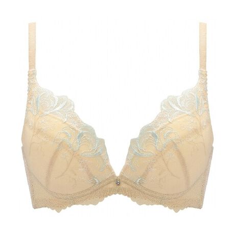 前中心が低くカップ脇の高いパターンのディープVシルエットと、シャープなカップ下できれいな谷間を作ります。