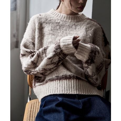 ウォーム感のある起毛糸で溶け込むようなニュアンス柄が目を惹くニットの登場です。