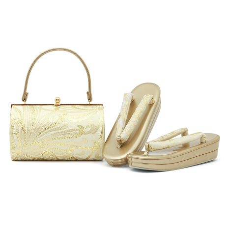 バッグと鼻緒は共布で、伝統的な花々をあしらった文様は上品で高級感のあるデザインです。