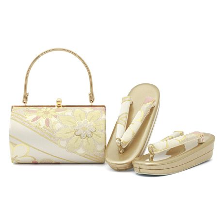バッグと鼻緒は共布で、伝統的な花々をあしらった文様は上品で高級感のあるデザインです。