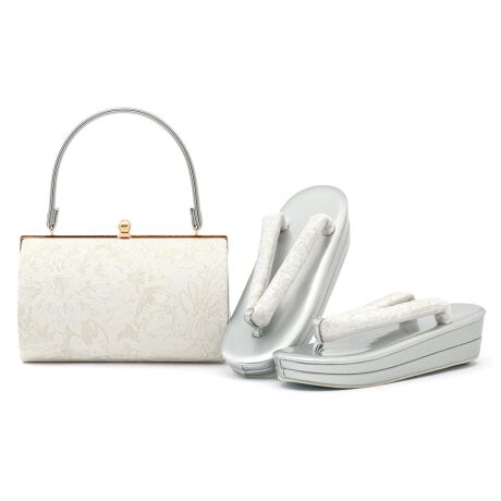 バッグと鼻緒は共布で、伝統的な花々をあしらった文様は上品で高級感のあるデザインです。