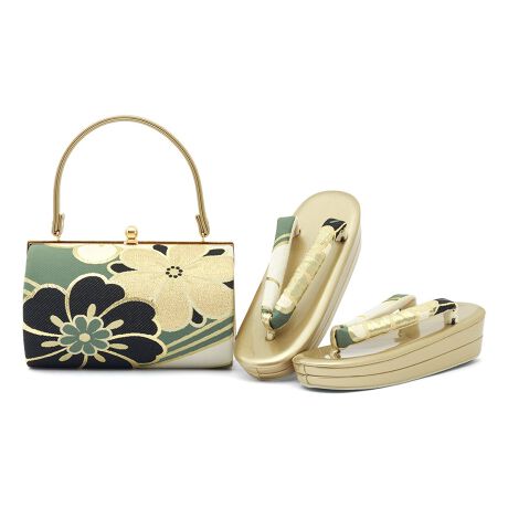 バッグと鼻緒は共布で、伝統的な花々をあしらった文様は上品で高級感のあるデザインです。