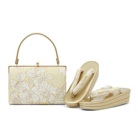 バッグと鼻緒は共布で、伝統的な花々をあしらった文様は上品で高級感のあるデザインです。