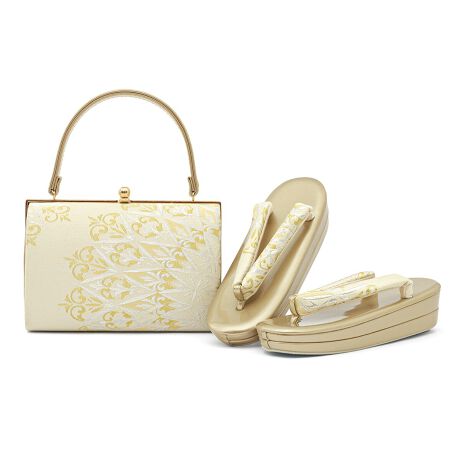 バッグと鼻緒は共布で、伝統的な花々をあしらった文様は上品で高級感のあるデザインです。