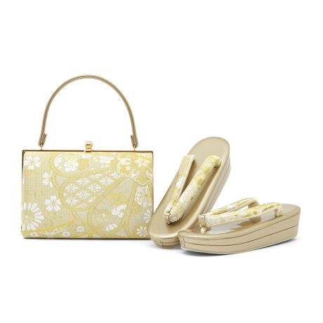 バッグと鼻緒は共布で、伝統的な花々をあしらった文様は上品で高級感のあるデザインです。