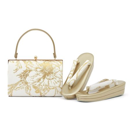 バッグと鼻緒は共布で、伝統的な花々をあしらった文様は上品で高級感のあるデザインです。