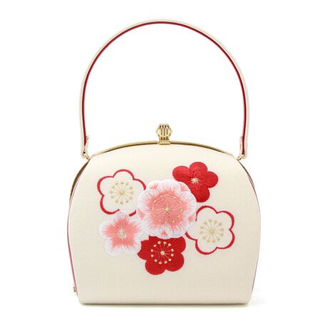 縮緬(ちりめん)生地に梅の花々が刺繍された華やかなデザインです。
