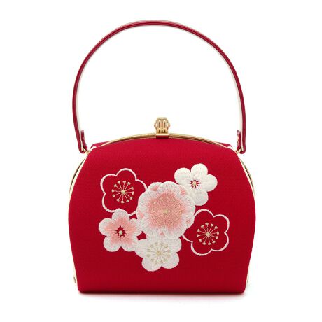 縮緬(ちりめん)生地に梅の花々が刺繍された華やかなデザインです。