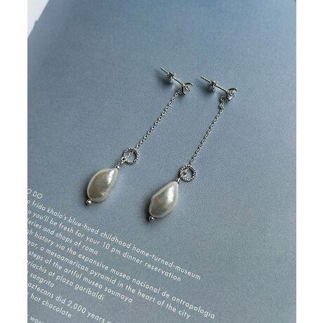 繊細なゴールドチェーンの先に、艶めくパールが優雅に揺れるロングピアス。