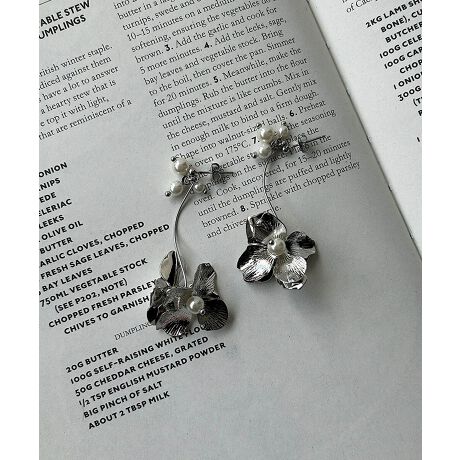 繊細に彫り込まれた花びらのメタルパーツが光を受けて艶やかに輝き、中心にあしらわれた小粒のパールが、凛とした女性らしさを引き立てます。
