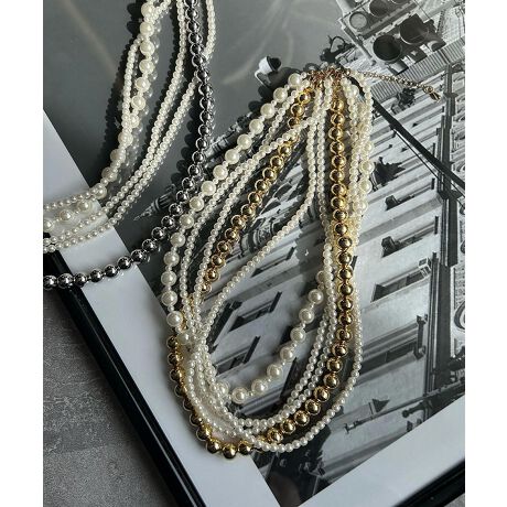 大粒・小粒のフェイクパールネックレスとメタリックのボールチェーンが連なった、上品で洗練された印象のネックレス。