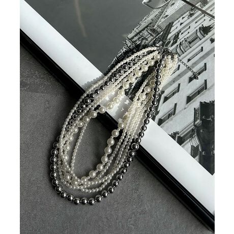 大粒・小粒のフェイクパールネックレスとメタリックのボールチェーンが連なった、上品で洗練された印象のネックレス。