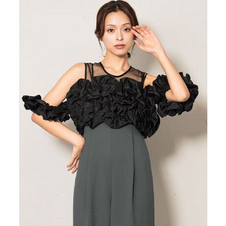 フリルビスチェは割繊素材でボリュームフリルを施し、華やかさと立体感を演出。
