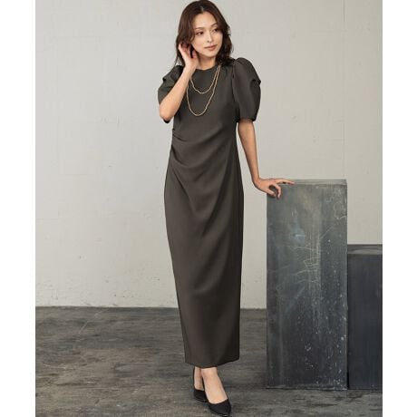 直線的なIラインシルエットに片側ウエストから流れるドレープを加えることで、身体のラインを美しく見せながらもスタイリッシュに気になるところをカバーできます。