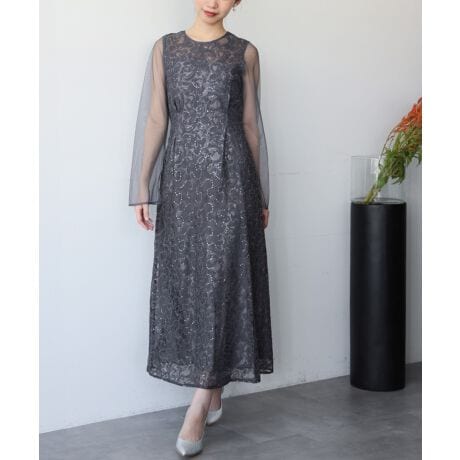 程よいとろみと落ち感のある素材で仕立てたワンピースにレース×チュールのアームカバーをセット。