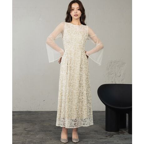 程よいとろみと落ち感のある素材で仕立てたワンピースにレース×チュールのアームカバーをセット。