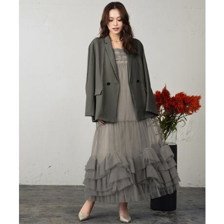 裾にたっぷりフリルをあしらったチュール素材のキャミワンピースと、ジャケットを組み合わせたセットアイテム。