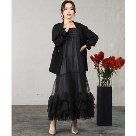 裾にたっぷりフリルをあしらったチュール素材のキャミワンピースと、ジャケットを組み合わせたセットアイテム。