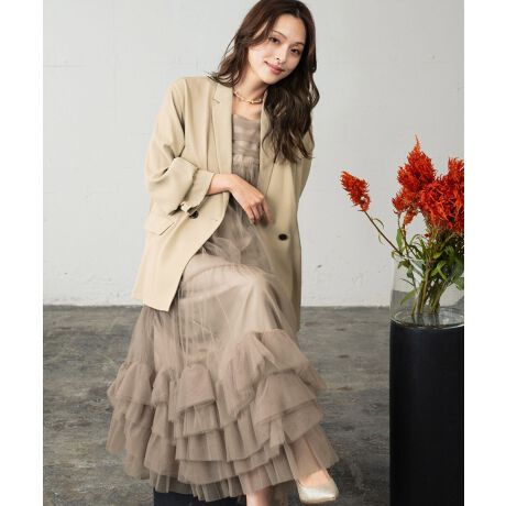 裾にたっぷりフリルをあしらったチュール素材のキャミワンピースと、ジャケットを組み合わせたセットアイテム。
