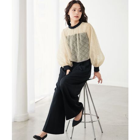ブラウスはパフスリーブがエレガントな雰囲気をプラスし、華奢見せ効果を叶えます。