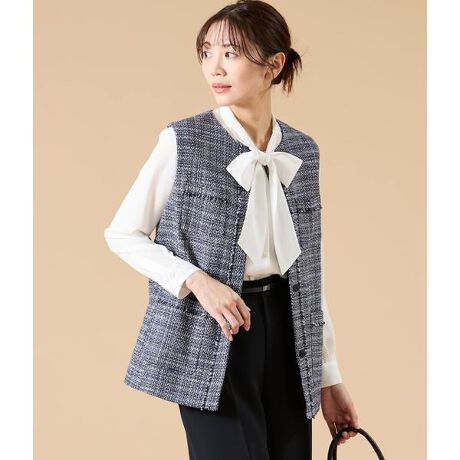 羽織るだけで一格上のスタイリングを楽しめるミックスツィードジレ。ジャケットよりもアレンジが効いて気負わず着られ、普段のデニムやワイドパンツにも自然に馴染む新定番アイテム。もちろん、入学式・卒業式・登壇・顔合わせなどの特別な日にも対応でき、1枚あると着こなしの幅がぐっと広がります。明るい会場や春の式典にも映えて、軽やかで優しく華やかな印象のライトグリーン、フォーマル感が高くほど良く引き締めてくれセレモニーやお仕事にも着回しの効くネイビーの2色展開。