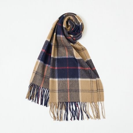 ベーシックで合わせやすい柄感で、コーディネートを華やかにするマフラー。