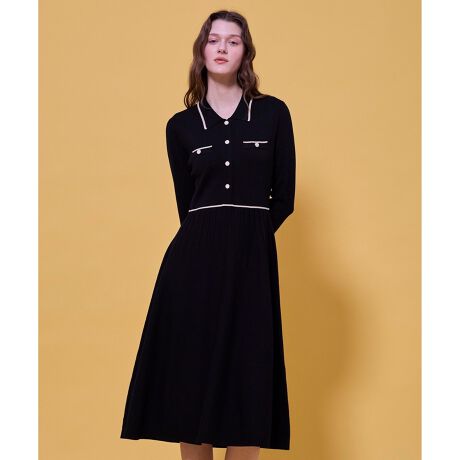 バイカラーデザインが印象的なニットドレス。柔らかなニット素材を使用しているため、着心地が良く、ほど良いフィット感で女性らしいシルエットを叶えてくれるのが魅力。襟やポケット口、ウエスト、袖口に施されたラインが全体を引き締め、上品でクラシカルな雰囲気を演出します。フロントのボタンデザインがアクセントになり、きちんと感をプラスしてくれます。一枚で着映えするのはもちろん、ジャケットやカーディガンを羽織ってオンオフ問わず幅広く活躍できる万能なアイテム。