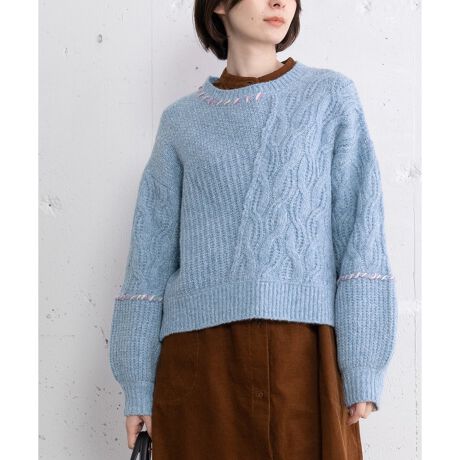 ハンドステッチ刺繍とななめに入ったケーブル柄。ほっこり感と遊び心を散りばめたニットです。リラクシーなオーバーサイズで、着るだけでこなれた雰囲気に。パンツ合わせでラフに着るのが今っぽくおすすめです◎
