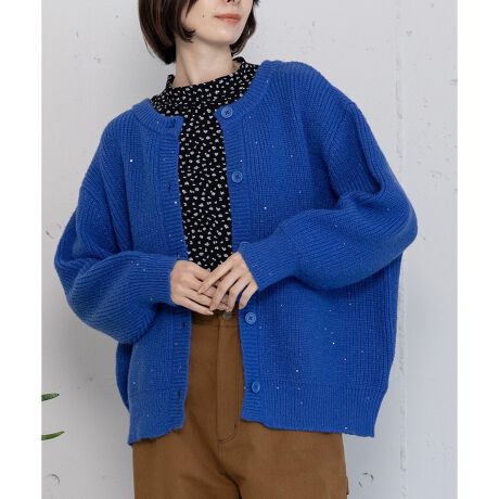 小さなスパンコールとラメ糸が織り交ぜられた、ほんのりきらめく片畦編みニット。カーディガン・プルオーバー両方で使える2way仕様。ざっくりとした片畦編みで、大人っぽくも甘さのあるデザインに仕上げました。ボトムに合わせて雰囲気を変えられる、頼れる一枚です◎