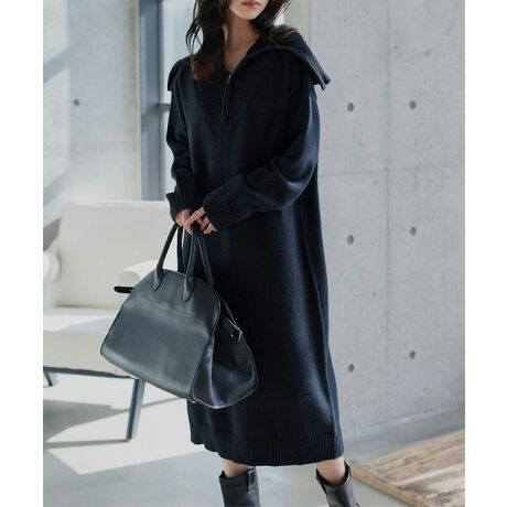フロントジップの閉じ具合でハイネック風にしたり、インナー合わせのレイヤードを楽しんだり様々な表情変化で着回せるロングニットワンピースです。