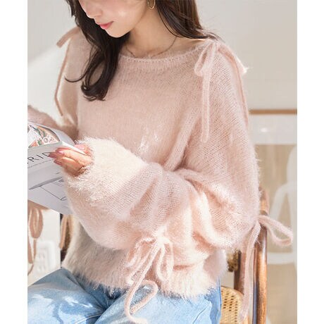 ふわっと軽やかなキャットヤーンの質感が、女性らしさをそっと引き立てる袖リボンシアーニット。