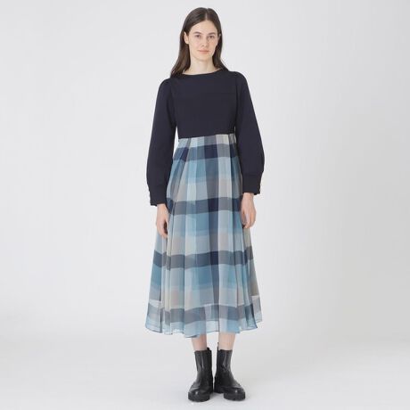 [型番:55J19674__]◆ふんわりシフォンが華やかなドッキングドレス【Design】ニットとオリジナルチェックのシフォン生地をドッキングさせたドレスです。ニット部分は、編地変化で表情豊かに仕上げました。スカート部分は生地をたっぷり使いながらもヒダにしてすっきりと見せたエレガントなシルエットにこだわりました。歩くたびにふわりと揺れるシルエットが目を引く華やかなドレスです。