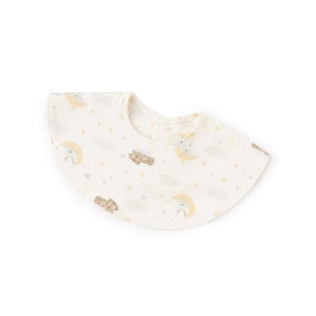 さまざまなモチーフをデザインした総柄のスタイです。個性的ながらも落ち着いた色合いで、日常に馴染みます。スナップボタンで簡単につけ外しできるのもうれしいポイント。防水機能を備えており、よだれをしっかりとガードします。
