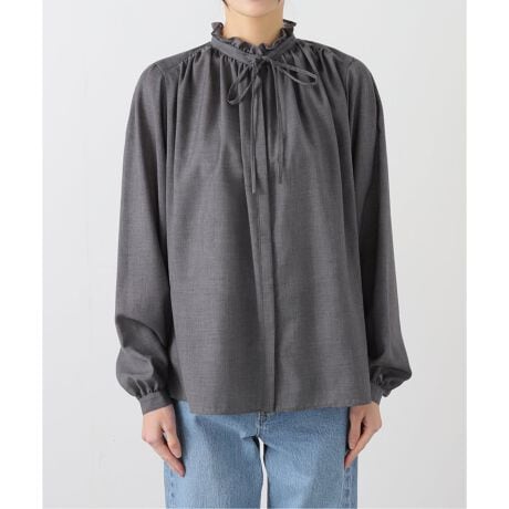 首元は詰まりぎみのデザインでクラシカルに、袖はタックディテールでシャープな印象をプラス。