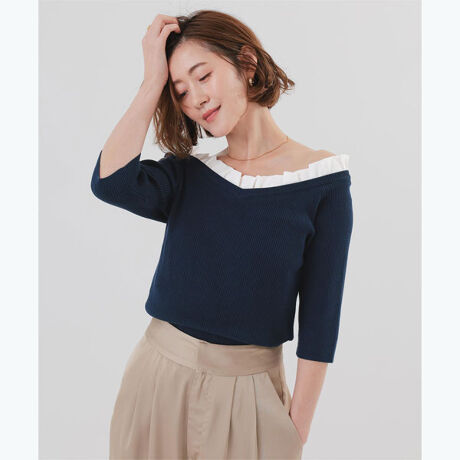 ネックラインにあしらったフリルが顔まわりを華やかに見せるトップス。肩を落としてオフショルダーとしても着られる2WAY仕様で、オン・オフ問わず着映えする一枚です。程よい長さのハーフスリーブが、二の腕をすっきり見せつつ軽やかな印象に仕上げます。[型番:BHXU1951]