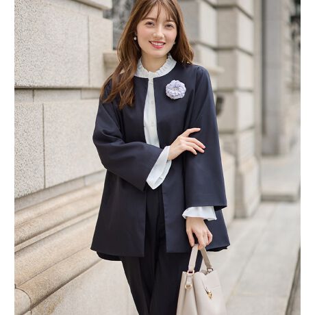 セット内容:Aラインジャケット、フリルブラウス、テーパードパンツの3点セット