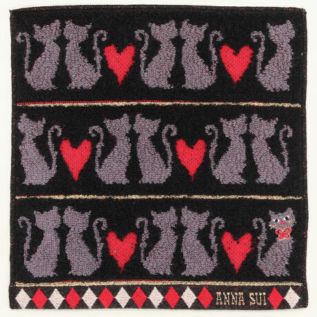 黒猫とハートがキュートなミニサイズのタオルハンカチ。アクセントとしてキラッと光るラメ糸を織り込み、手のひらやポケットに収まりやすい小ぶりなサイズに仕上げました。ふんわりと柔らかい、吸水性の良い素材です。