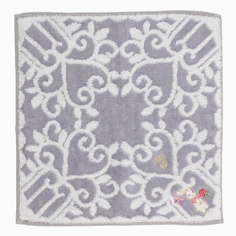 凹凸感のあるジャカード生地にキュートなワンポイント刺繍をあしらったタオルハンカチです。薔薇や蝶々に囲まれた動物たちが、のんびりと庭でくつろいでいるイメージに仕上げました。