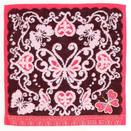 ブランドアイコンのバタフライにハートをあしらったタオルハンカチ。凹凸感の異なる織りにバタフライのアップリケ刺繍を合わせ、華やかな1枚に仕上げました。