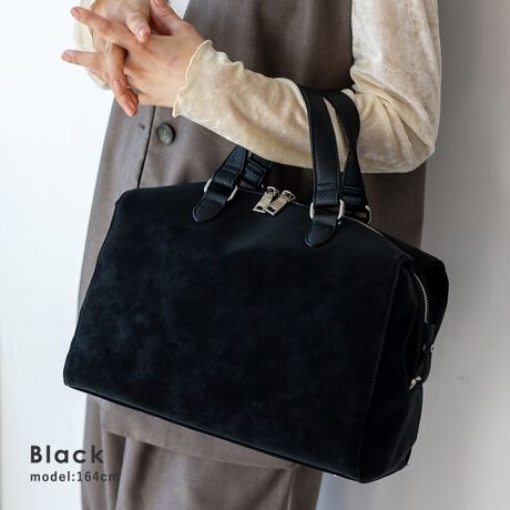 流行りのスエード風素材を使用した、上品見えのスクエア型ボストンバッグ。