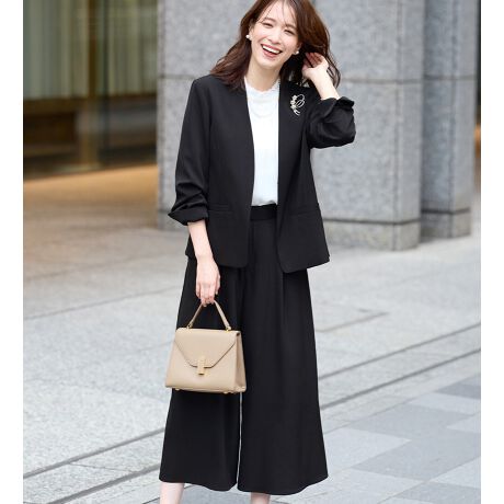 スッキリ見えするカラーレスジャケットにガウチョパンツの組み合わせがスタイリッシュ。
