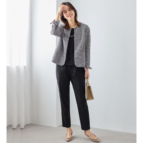 スッキリと見えるノーカラーで、こなれ感のある装いに。