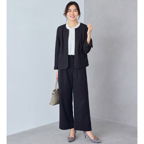 スッキリと見えるノーカラーで、こなれ感のある装いに。