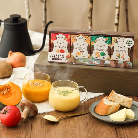 【かぼちゃときのこのスープ】かぼちゃパウダー(かぼちゃ(北海道産))、かぼちゃフレーク(かぼちゃ(北海道産))、乳等を主要原料とする食品(乳糖、全粉乳、植物油脂、加糖脱脂練乳、デキストリン、その他)、砂糖、乾燥マッシュポテトパウダー(馬鈴薯(北海道産))、バター加工品、椎茸エキスパウダー、チーズパウダー(ナチュラルチーズ(北海道産))、脱脂粉乳、マッシュルームエキスパウダー、食塩、チキンブイヨンパウダー、調味パウダー、粉末油脂、ソテーオニオンエキスパウダー、酵母エキス、うきみ(乾燥まいたけ)/増粘剤(加工デンプン、キサンタン)、調味料(アミノ酸等)、乳化剤、酸化防止剤(V.E)、pH調整剤、カゼインNa、香料、酸味料、(一部に乳成分・小麦・大豆・鶏肉・豚肉を含む)【じゃがいもとカレーのスープ】じゃがいもフレーク(じゃがいも(北海道産))、乾燥マッシュポテトパウダー(じゃがいも(北海道産))、乳等を主要原料とする食品(乳糖、全粉乳、植物油脂、加糖脱脂練乳、デキストリン、その他)、粉末油脂、バター加工品、ソテーオニオンエキスパウダー、香辛料、りんご果汁パウダー、ビーフブイヨン風味パウダー、はちみつパウダー、食塩、チーズパウダー(ナチュラルチーズ(北海道産))、ベース調味料、砂糖、野菜ブイヨン風味パウダー、うきみ(フライドポテト(じゃがいも(北海道産)、食物油脂))/調味料(アミノ酸等)、増粘剤(加工デンプン)、乳化剤、カゼインNa、pH調整剤、香料、酸味料、香辛料抽出物、酸化防止剤(V.E)、(一部に乳成分・小麦・大豆・りんご・ごま・豚肉を含む)【コーンとチーズのクリームスープ】チーズパウダー(国内製造又はデンマーク製造)、スイートコーンパウダー(とうもろこし(北海道産))、砂糖、でん粉、クリーミングパウダー、デキストリン、食塩、チキンエキスパウダー、乳等を主要原料とする食品、オニオンパウダー、酵母エキスパウダー、香辛料、うきみ(パセリ)/乳化剤、pH調整剤、香料、カロチン色素、酸化防止剤(V.E)、クエン酸、二酸化ケイ素、(一部に乳成分・大豆・鶏肉を含む)【オニオンとトマトのスープ】オニオンパウダー(玉ねぎ(北海道産))、乾燥トマト粉末、ローストオニオンパウダー(オニオンフレーク、デキストリン)、オニオンエキスパウダー(オニオンエキス、デキストリン、砂糖、オニオンオイル)、セロリエキスパウダー(デキストリン、セロリエキス、食塩、醤油)、トマト風味調味料(デキストリン、トマトパウダー、砂糖、ぶどう糖、その他)、チキンブイヨン風味パウダー、トマト調味料、チキンコンソメ、オニオン調味料、椎茸エキスパウダー、砂糖、食塩、香辛料、うきみ(フライドオニオン(玉ねぎ(北海道産)、食物油脂)、パセリ)/調味料(アミノ酸等)、増粘剤(加工デンプン)、酸味料、乳化剤、着色料(ベニバナ黄)、酸化防止剤(V.E)、(一部に小麦・大豆・鶏肉を含む)