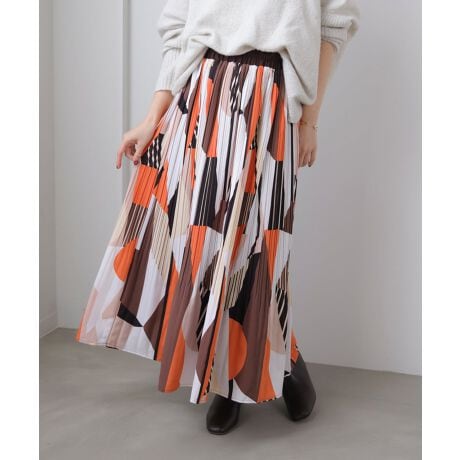 視線を引きつける幾何柄と、動くたびに表情が出るプリーツが魅力のスカート。縦ラインを強調するシルエットで、自然とスタイルアップを叶えてくれます。存在感のある柄ながら、落ち着いた配色でトップスを選ばず着回しやすいのもポイント。春らしい軽やかさとトレンド感を兼ね備え、コーディネートの主役になる一枚です。