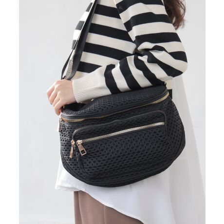 「小さいバッグじゃ足りない…」そんな声から選ばれる、頼れるドットメッシュのボディバッグ。見た目はすっきりなのに、長財布・ポーチ・スマホもしっかり入る大容量設計です。中にも外にもポケットがあり、荷物が迷子にならず出し入れもスムーズ。ドットメッシュの軽やかな表情に、ゴールドのファスナーがさりげなく上品さをプラス。カジュアルすぎず、大人のきれいめコーデにも自然になじみます。両手が空くので、旅行やお出かけ、アクティブな日にも活躍する万能バッグです。